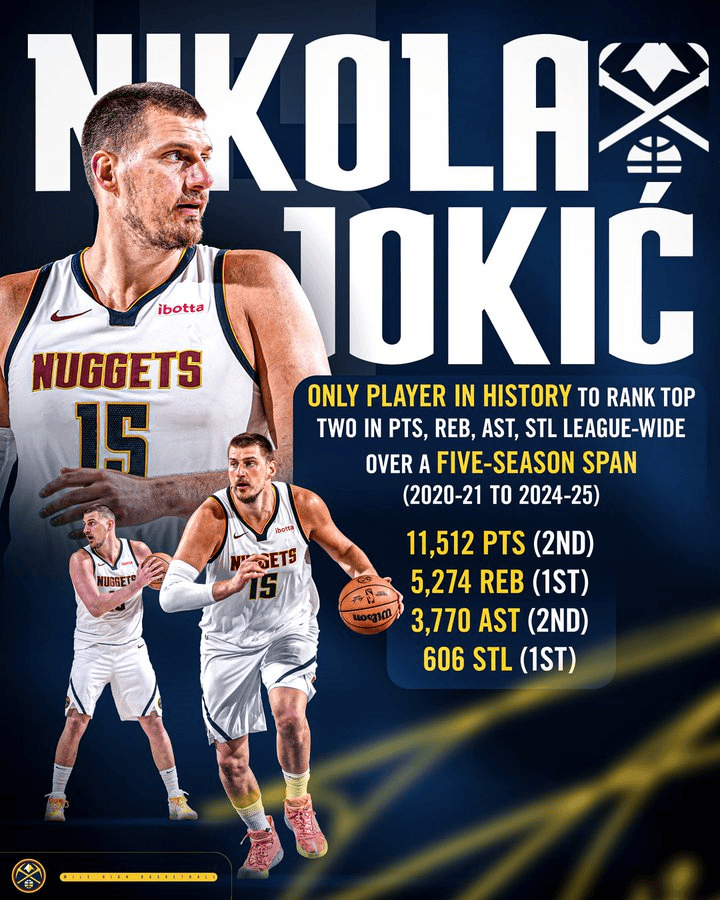 尼古拉-约基奇是历史上唯一在连续五个赛季中(常规赛+季后赛)总得分、篮板、助攻、抢断均排在联盟前二的球员。”