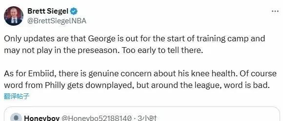 据美媒ClutchPoints记者Brett Siegel报道:目前76人的情况并不乐观,乔治因伤可能会缺席季前赛。至于恩比德76人特意淡化了他的一些传闻,但据我所知,并不是很乐观,他不仅有可能不会参加季前赛,可能常规赛前面的比赛也有可能缺席。